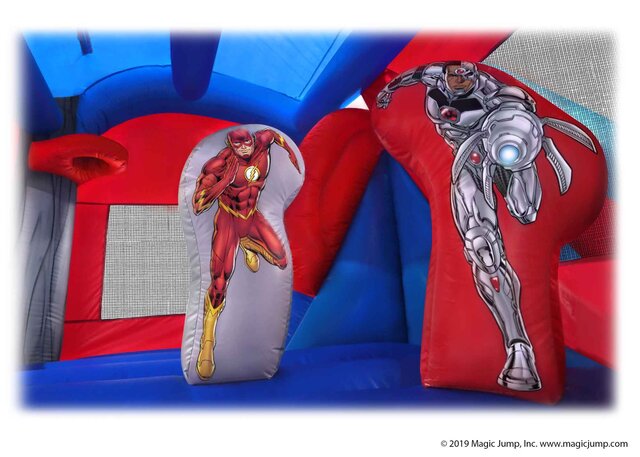 Team up with DC's iconic Super Heroes at the Hall of Justice with 2 Dads Bounce Houses Official JUSTICE LEAGUE™ 6-in-1 Combo Wet or Dry unit. This Wet or Dry combo ride features six different inflatable activities: (1) a bigger bouncing area; (2) a basketball hoop; (3) inflated push-through, obstacle pop-ups; (4) a wall climber; (5) a "high platform" wet or dry slide; and (6) a removable pool/landing for wet use. It also features a special non-slip material that Magic Jump uses for safe use with water.